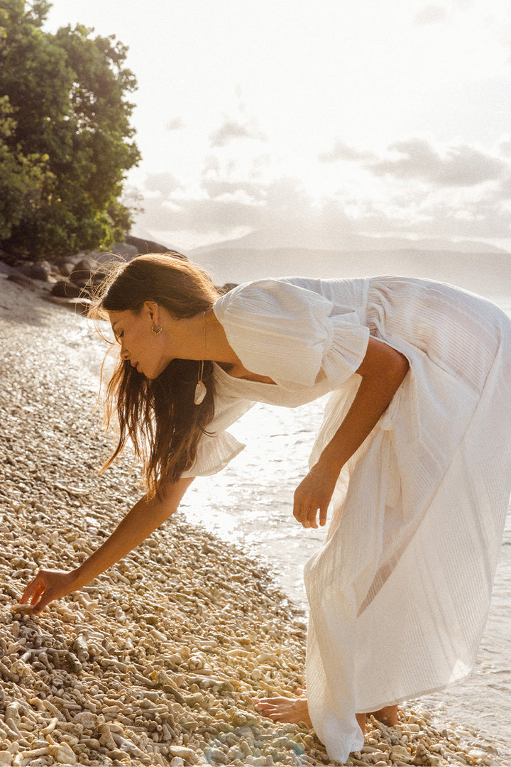 The Uma Maxi Dress is a classic piece slowly and ethically handcrafted from 100% cotton with soft textured stripe detailing. This self-adjustable wrap design provides the perfect balance between a casual and styled look with the special addition of pockets and cute ruffle sleeves for an elegant finish.