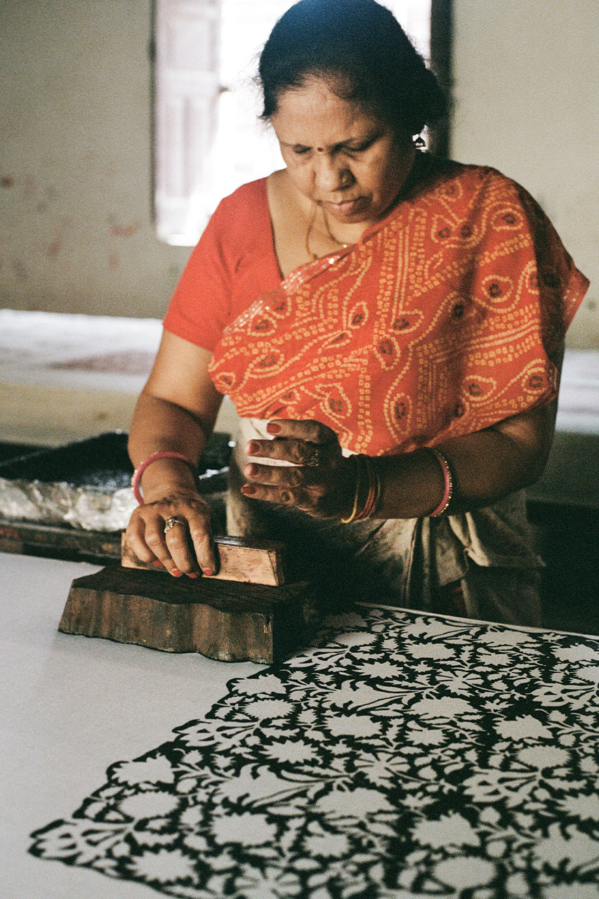 Our signature hand block printed Kyra design in Pepper ~ a traditional Jaal block print featuring a network of white flowers bordered with light brown detailing on a soft black base.