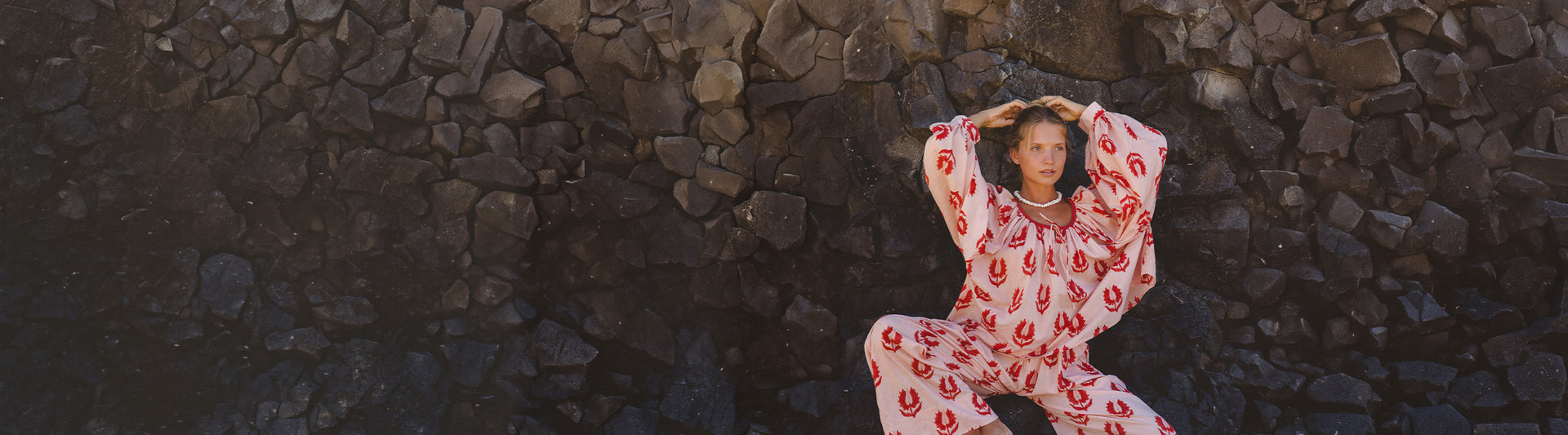 Shanti Tee Pink — front view at beach rocks, pink oversized cotton tee with red hand-printed Daughters of India mandala logo, red hibiscus flower in hair, ocean rocks backdrop | Daughters of India Shanti Tee Pink — back view at beach, pink oversized cotton tee showing clean back and oversized fit, ocean and rocks backdrop | Daughters of India